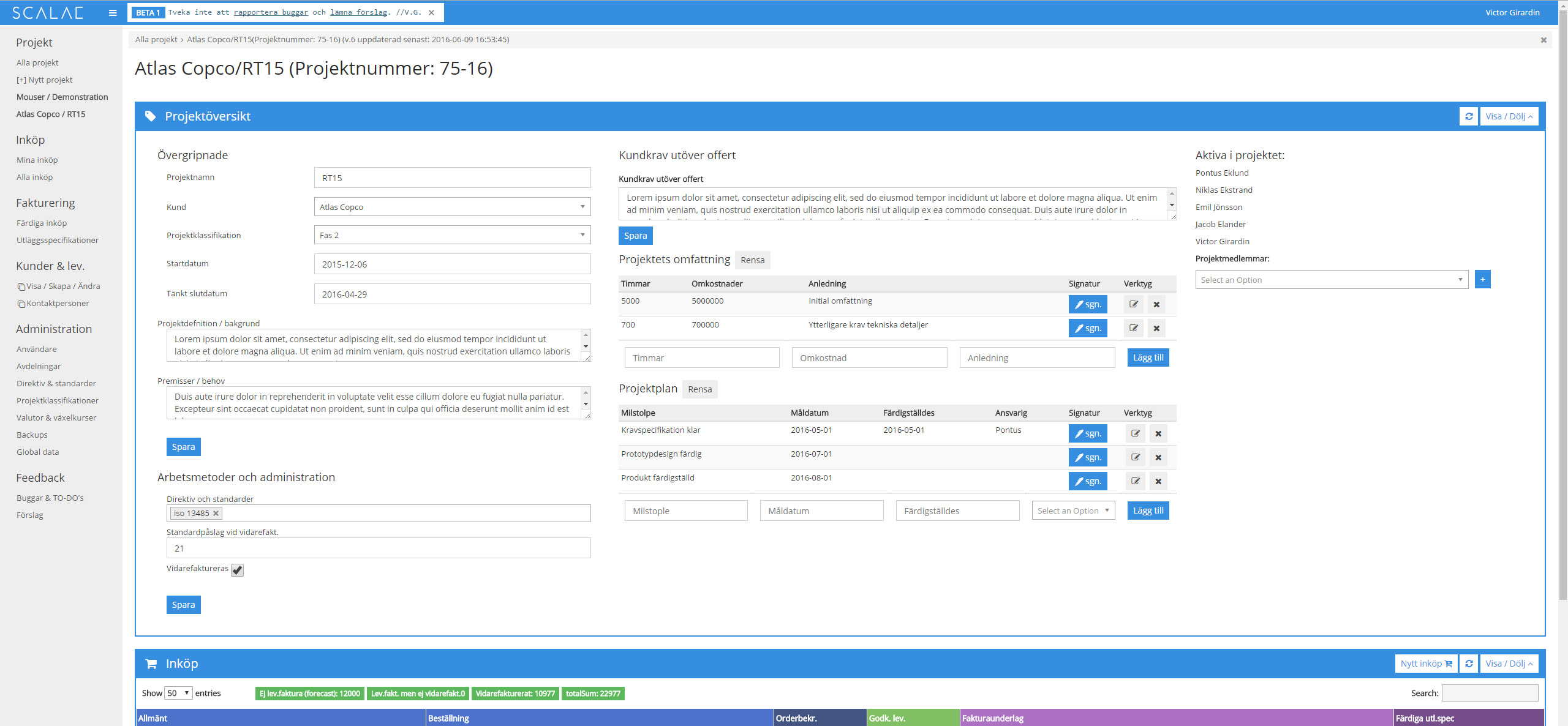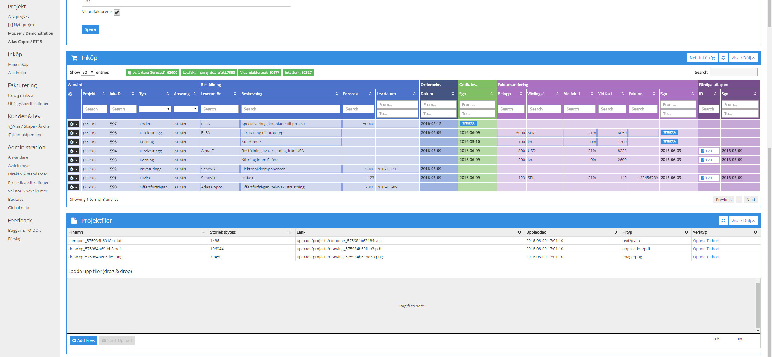 The user is faced with this view when browsing and working with a projects registered purchases and files.